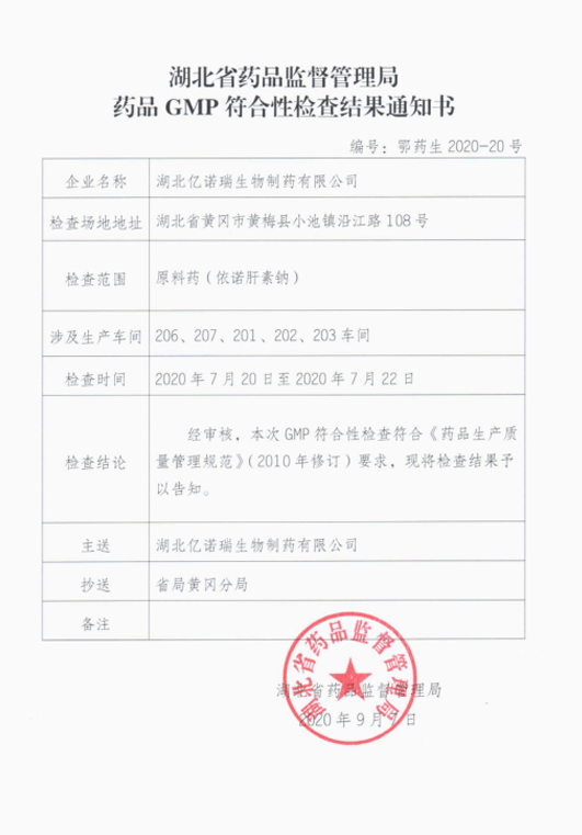 本次检查过程中,检查员对湖北亿诺瑞GMP质量管理体系,依诺肝素钠产品生产检验等现场进行了专业而严谨的审计,最终对亿诺瑞提出7条一般缺陷项。检查结束后10天内,亿诺瑞组织对所提出缺陷项进行整改,并形成整改报告提交至湖北药监局。整改报告通过湖北药监局审核,于2020年09月07日获得湖北省药品监督管理局出具GMP符合性检查通过通知。