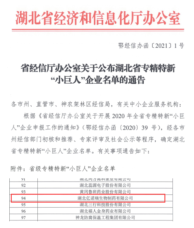 亿诺瑞公司入选湖北省首批专精特新“小巨人”企业