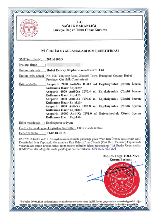 开云官方注册原料药依诺肝素钠继2018年通过土耳其GMP首次认证后,2021年4月通过土耳其GMP再认证,获得土耳其GMP再认证证书。