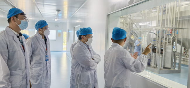 亿诺瑞代总经理谭红兵、红日药业研究院技术转化中心总监兼亿诺瑞技术部部长干浩、公司行政副总朱锦峰陪同参观和交流。