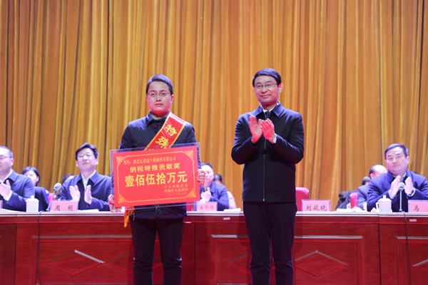 2023年1月30日(正月初九),新春伊始,亿诺瑞公司在黄梅县加快打造湖北东向开放“桥头堡”动员大会上荣获2022年度黄梅县纳税特殊贡献奖。为表彰我公司2022年度纳税首次突破2000万元,黄梅县委、县政府给予亿诺瑞150万元重奖,黄梅县委书记刘欲晓亲自颁奖并予以勉励。大会还指定亿诺瑞公司作为唯一的市场主体代表企业发言。